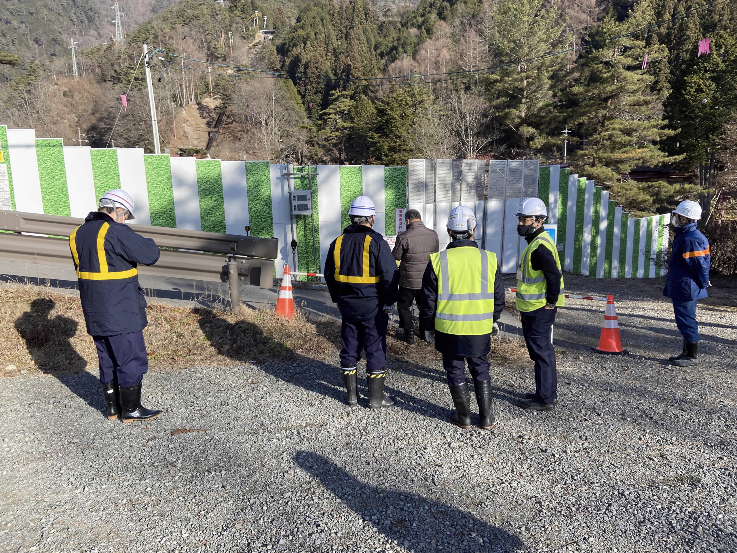 2021.12.23 まちづくり委員会【地域振興】斜坑トンネル発破作業の騒音確認を実施しました。 12月23日にまちづくり委員会役員及び切石区自治会役員の他、飯田市リニア対策課、土木課の職員が参加し、妙琴公園入口付近と公園内駐車場の2か所に分かれてリニア工事斜坑トンネル掘削の発破作業の騒音確認を行いました。 発破作業は、12月16日から1日3回(昼間2回、夜1回)実施されており、防音扉の設置などの対策を取りながら行われています。