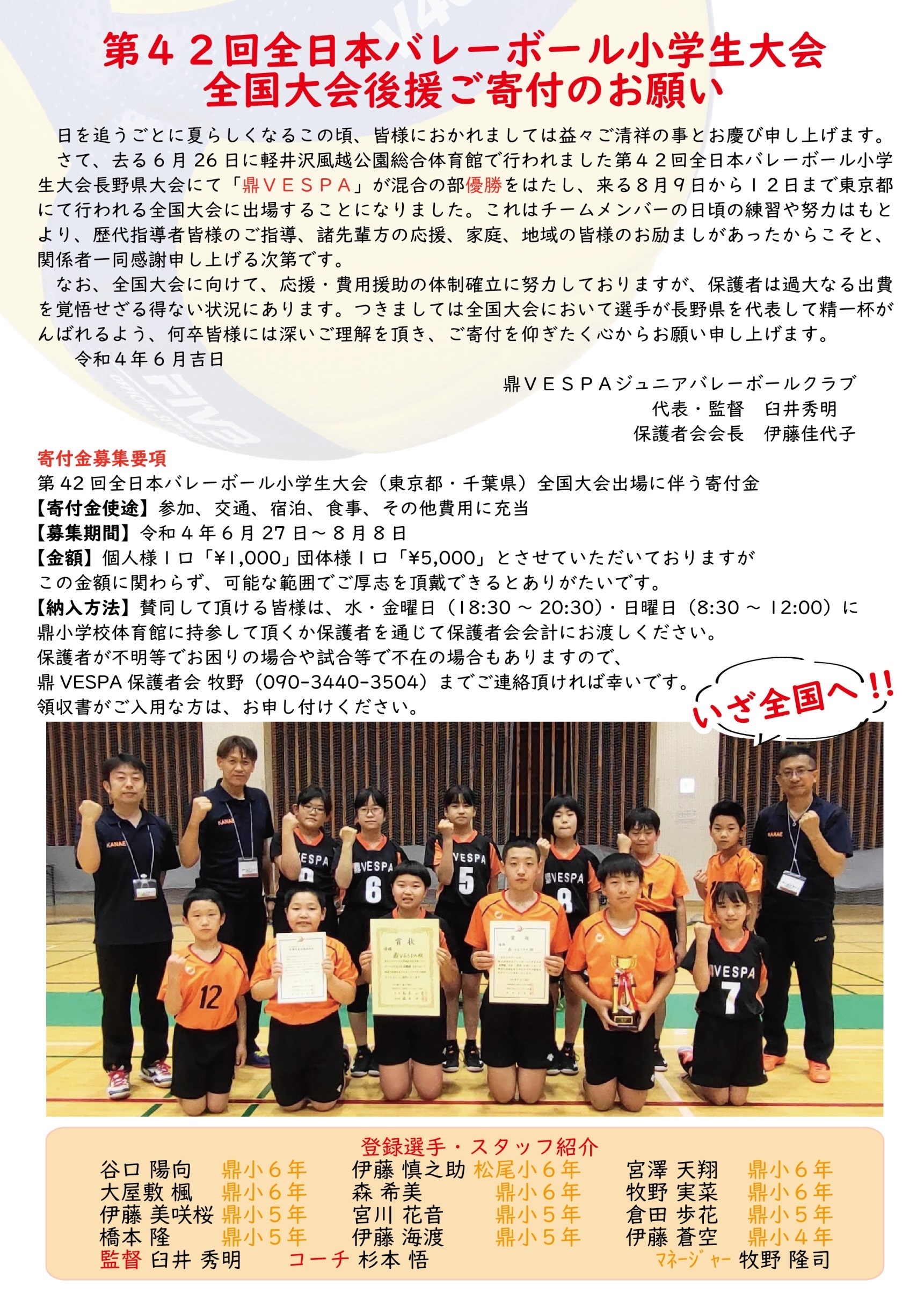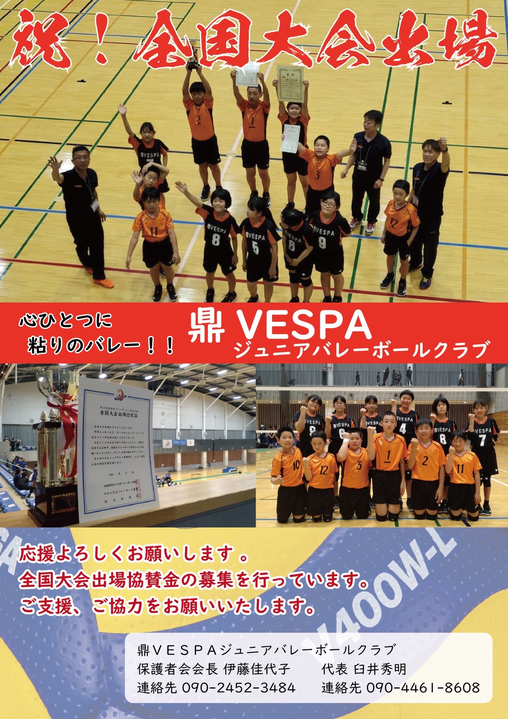 2022.07.04 お知らせ祝!鼎VESPAジュニアバレーボールクラブ全国大会出場! 鼎VESPAジュニアバレーボールクラブが全国大会に出場します! 組合回覧で全国大会参加のための寄付を募っています。ご協力お願いします。