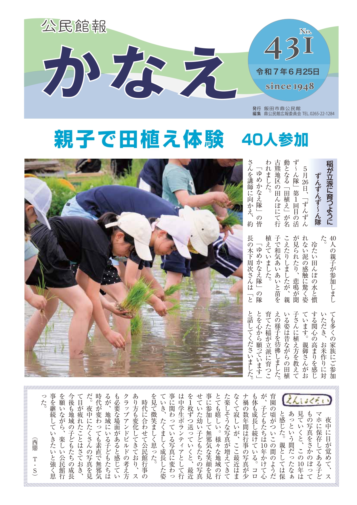 2025.10.13 公民館報かなえ431号を掲載しました。 公民館報かなえ431号を掲載しました。 掲載が遅くなってしまい申し訳ございません。 こちらからダウンロードできます。→公民館報かなえ431号