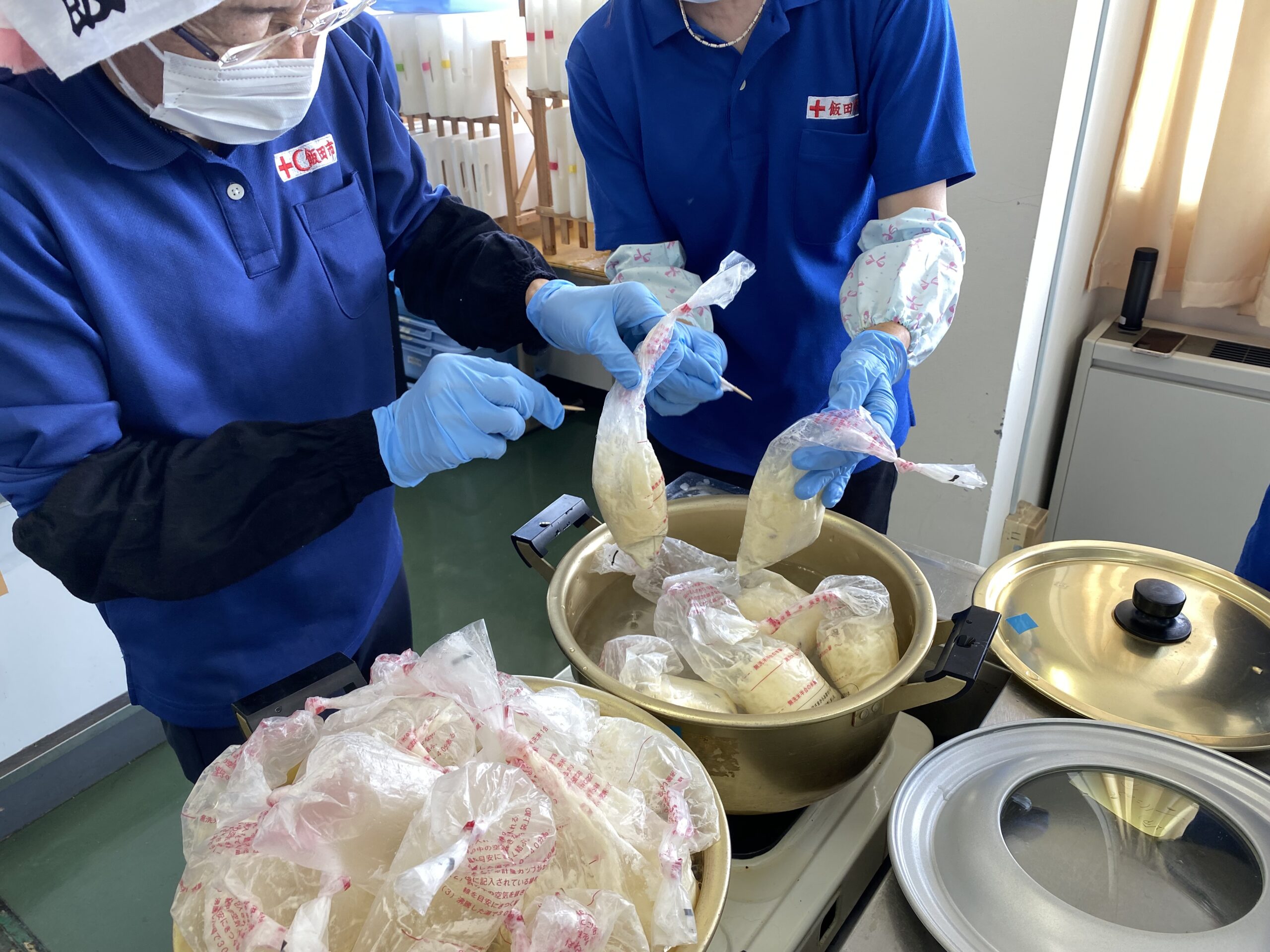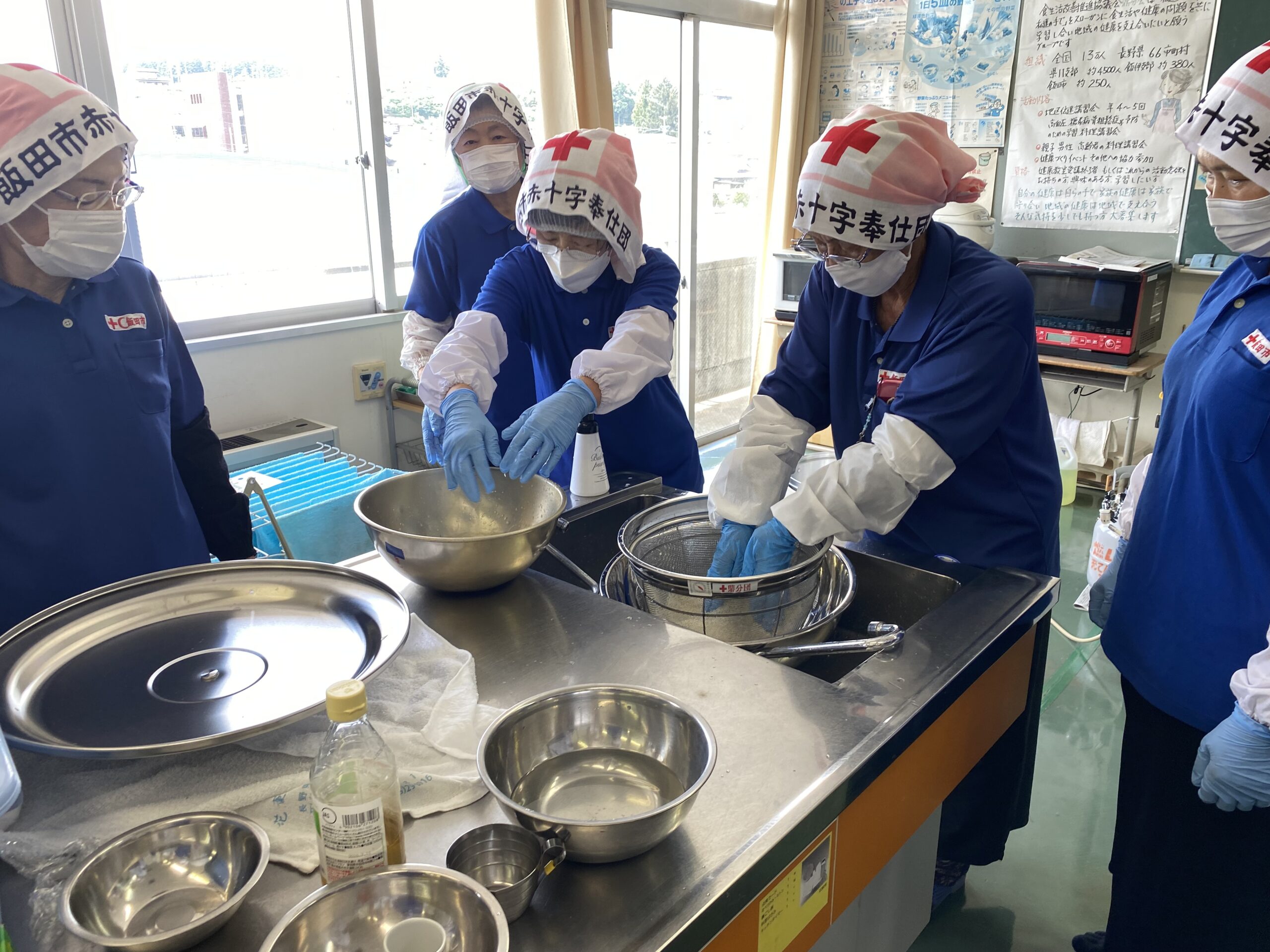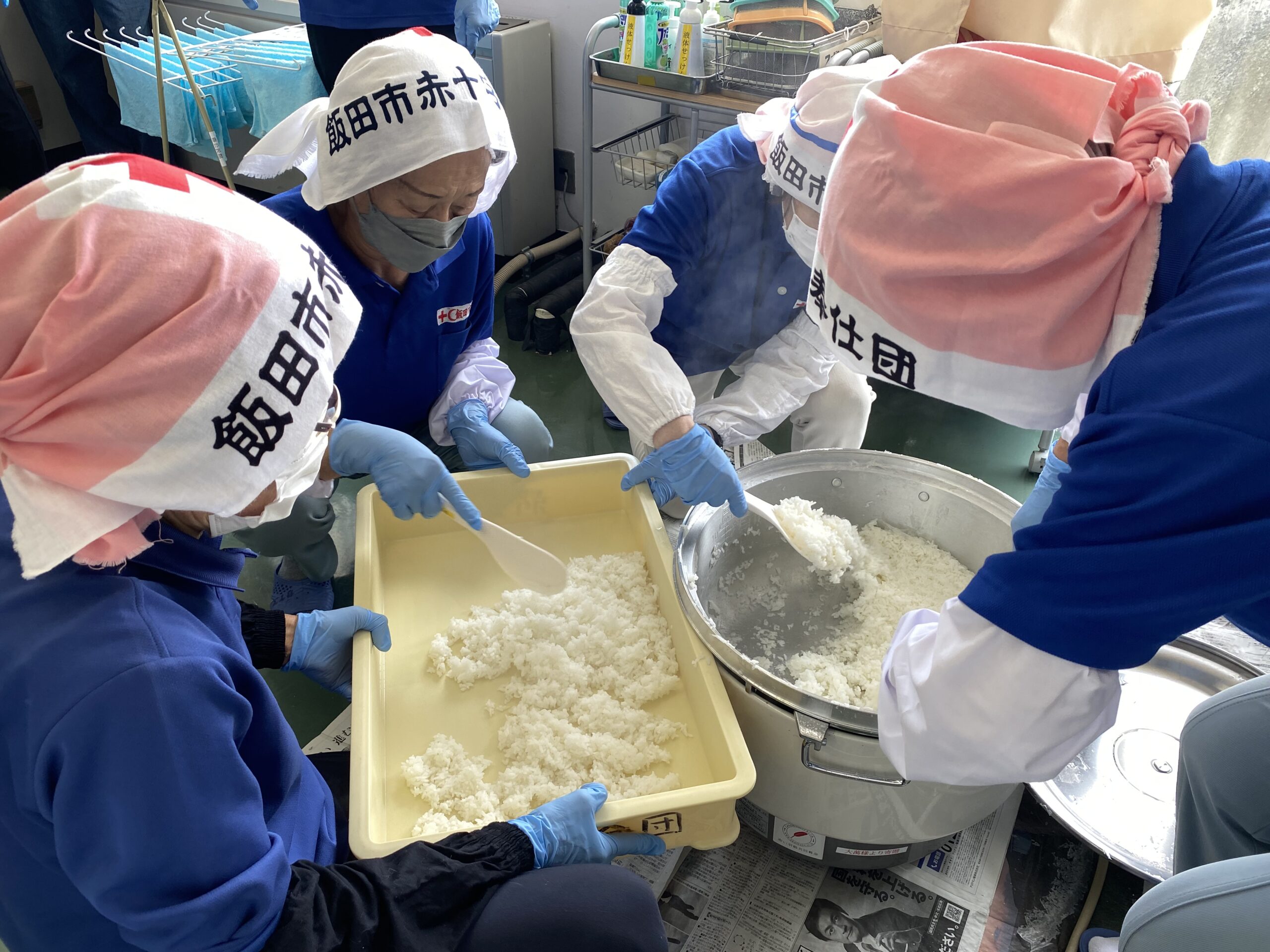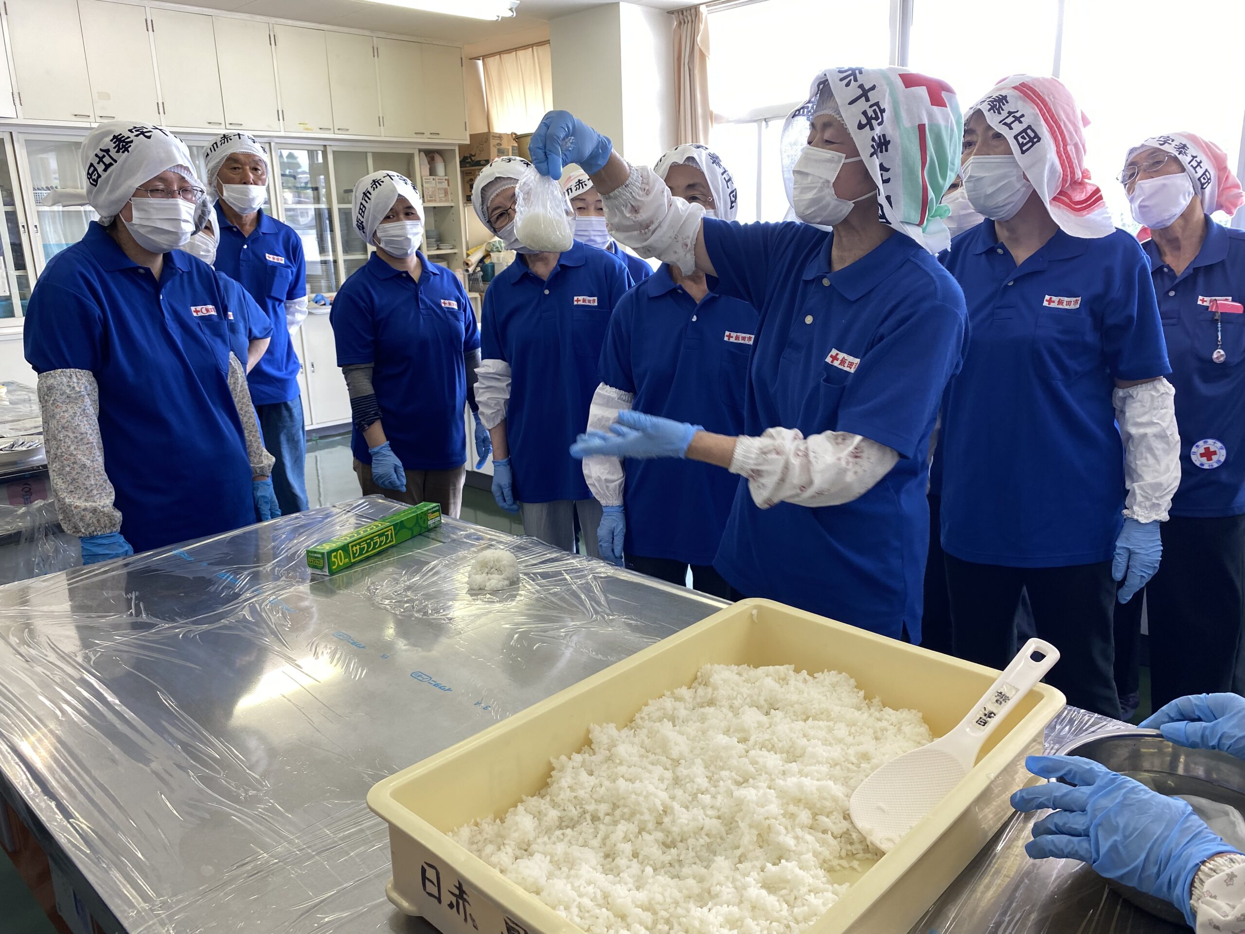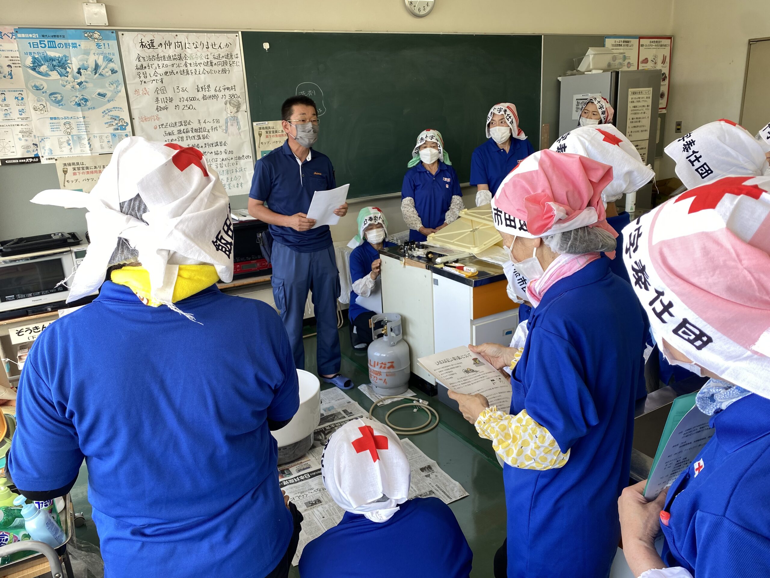 7月9日(土)赤十字奉仕団鼎分団では、飯田市赤十字奉仕団の副委員長2名と大萬(株)様に講師としてお越しいただき、各班正副班長22名を対象に炊き出し訓練を行いました。