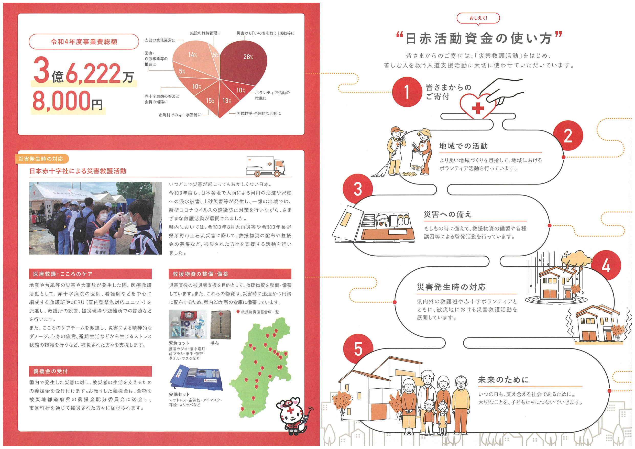昨年の飯田市全体の募金額は13,887,343円、募金の約6割は飯田地域の福祉事業に、約4割は県の福祉事業、災害等の準備金や地域の防災物品の整備などに使われています。