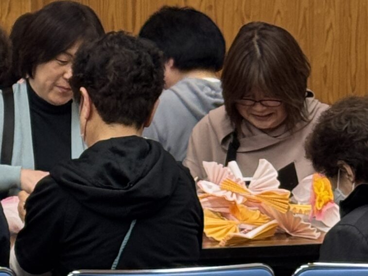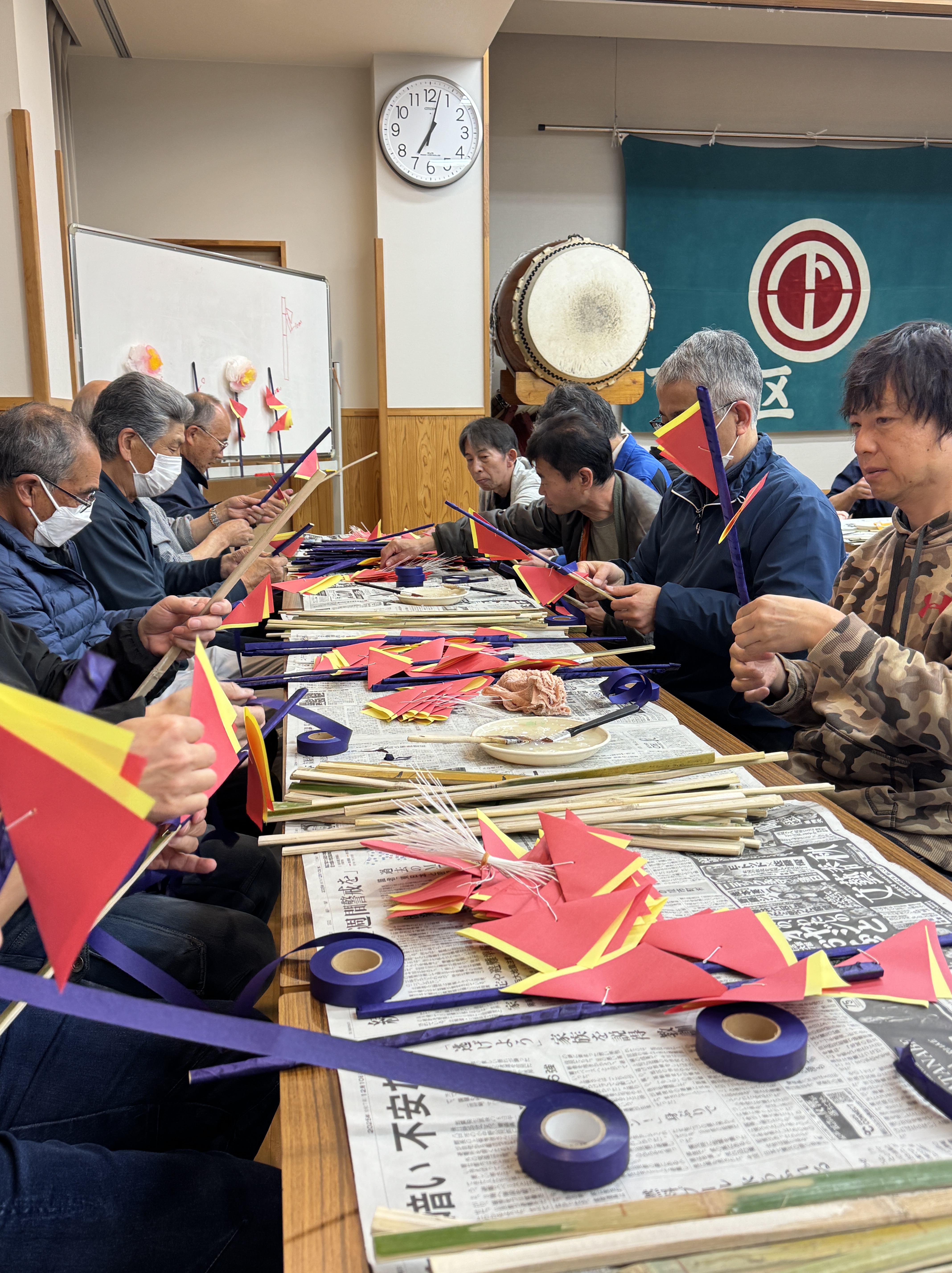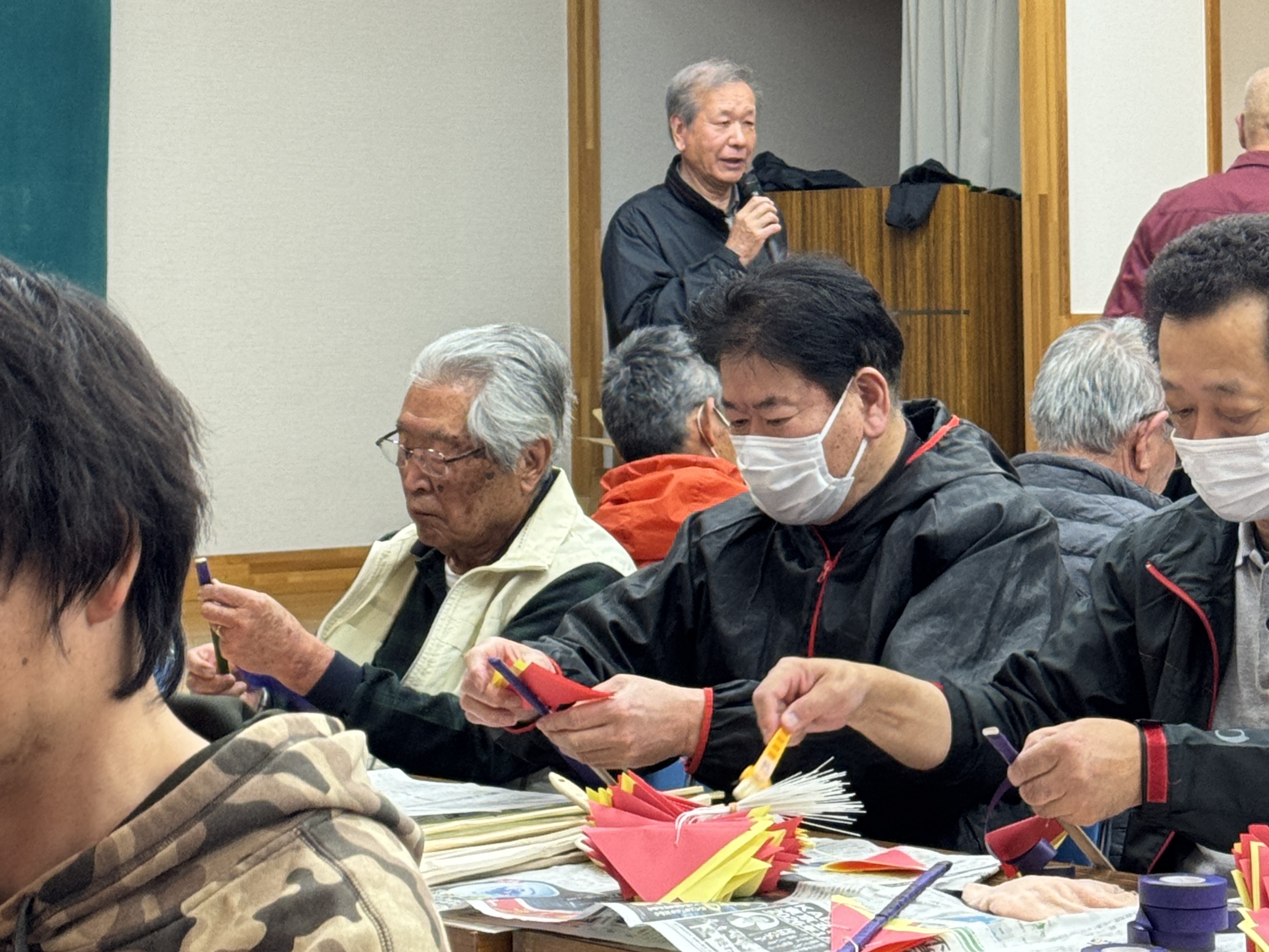 4月6日(月)下山区民会館にて、この週末行われる矢高諏訪神社春季祭典獅子舞奉納へ向けて「お花づくり」を行いました。この「お花づくり」には獅子舞保存会、区役員、組長、小中PTAの皆さんが参集し、1000本を超える「お花」を作りました。祭典当日の2日間下山区内を親若獅子が巡行し、ご所望をいただいた各戸皆さんへ獅子舞披露後、1年間の無病息災を祈りお配りします。