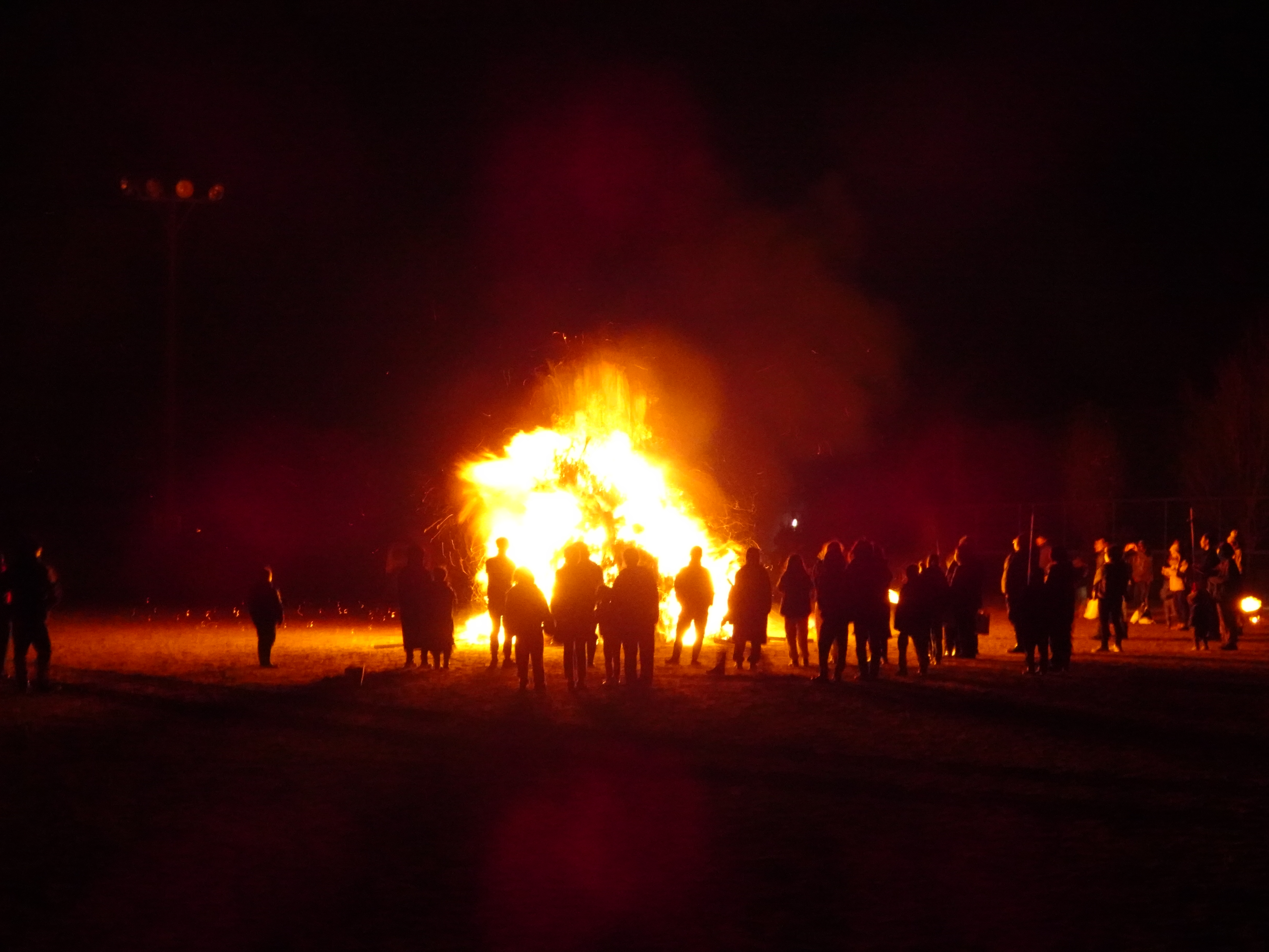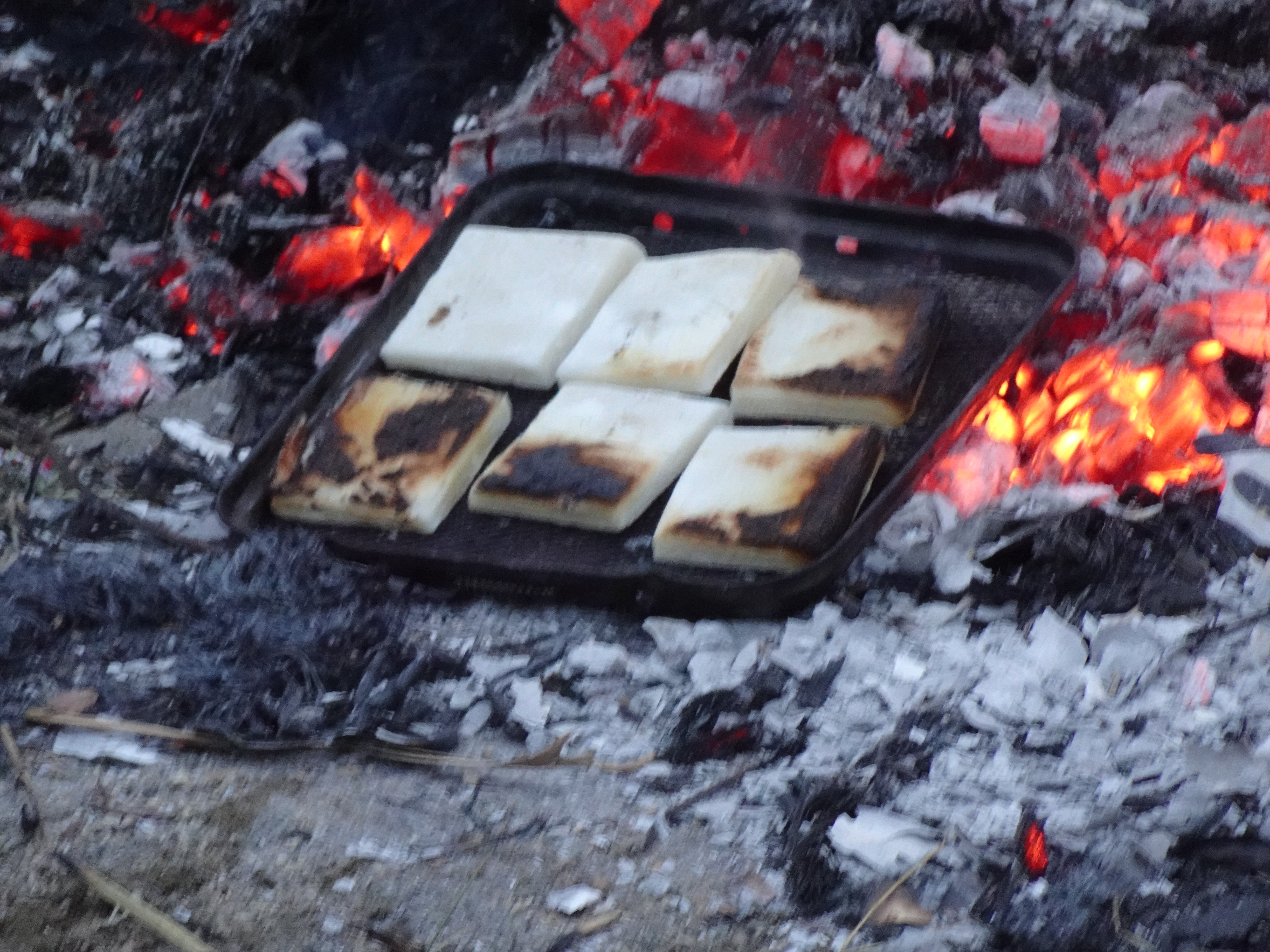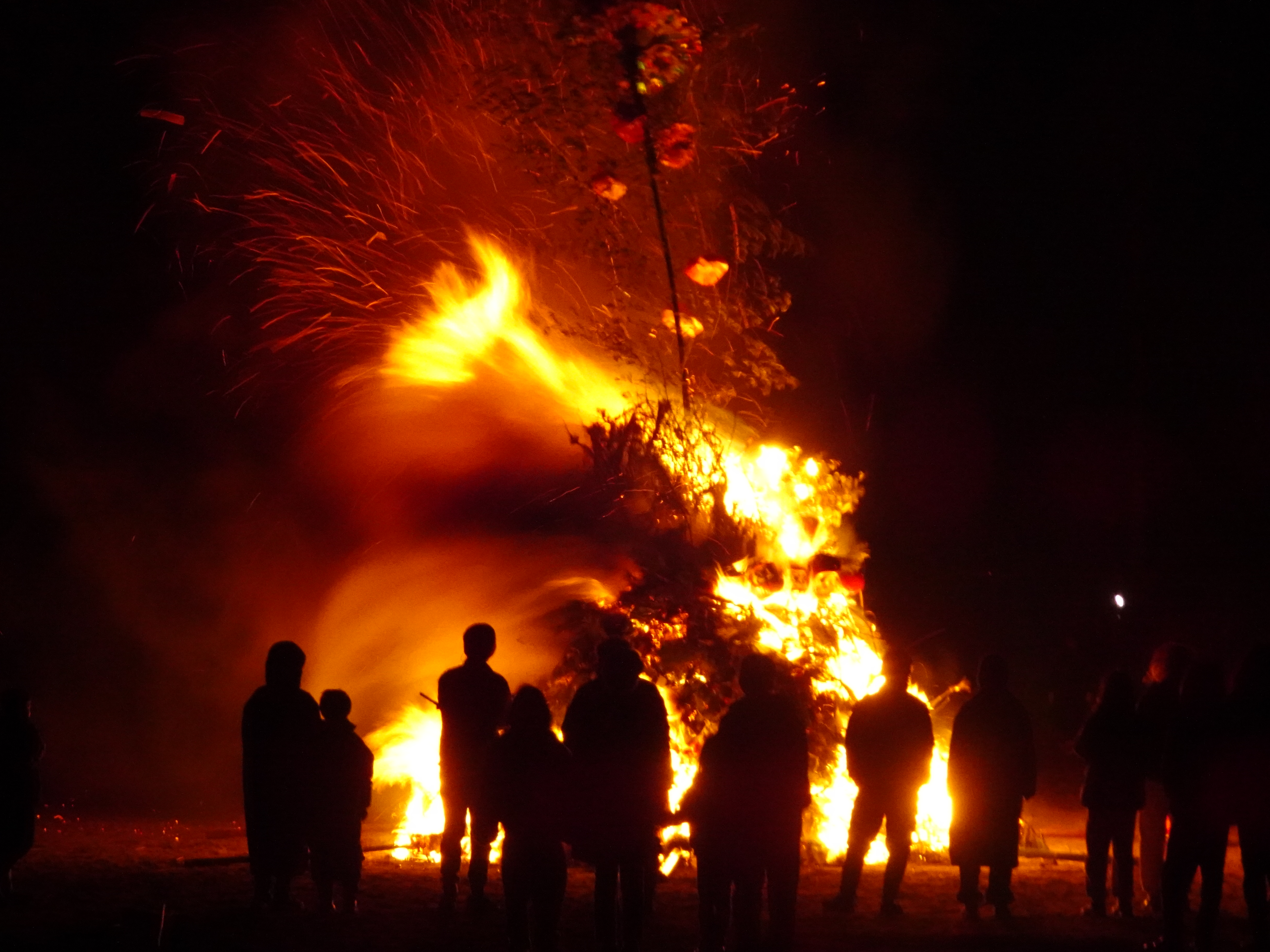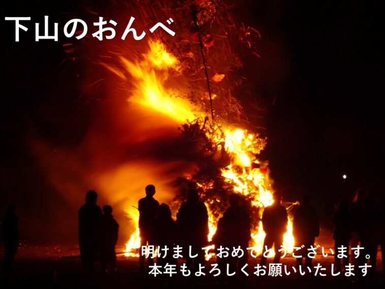 1月11日(日)矢高運動場にて下山地区のおんべを行いました。前日に小学校PTA下山支部の親子皆さんが区内各戸の松飾を集め、冬空高く組み立てたおんべを未明6時すぎに点火。強風とともに炎が舞い上がり、あっという間に幣束に火がつきました。炎がおさまり燠ができると、家から持ってきた餅を今年1年の無病息災を祈りながら焼き始めました。