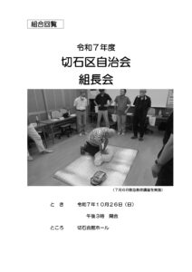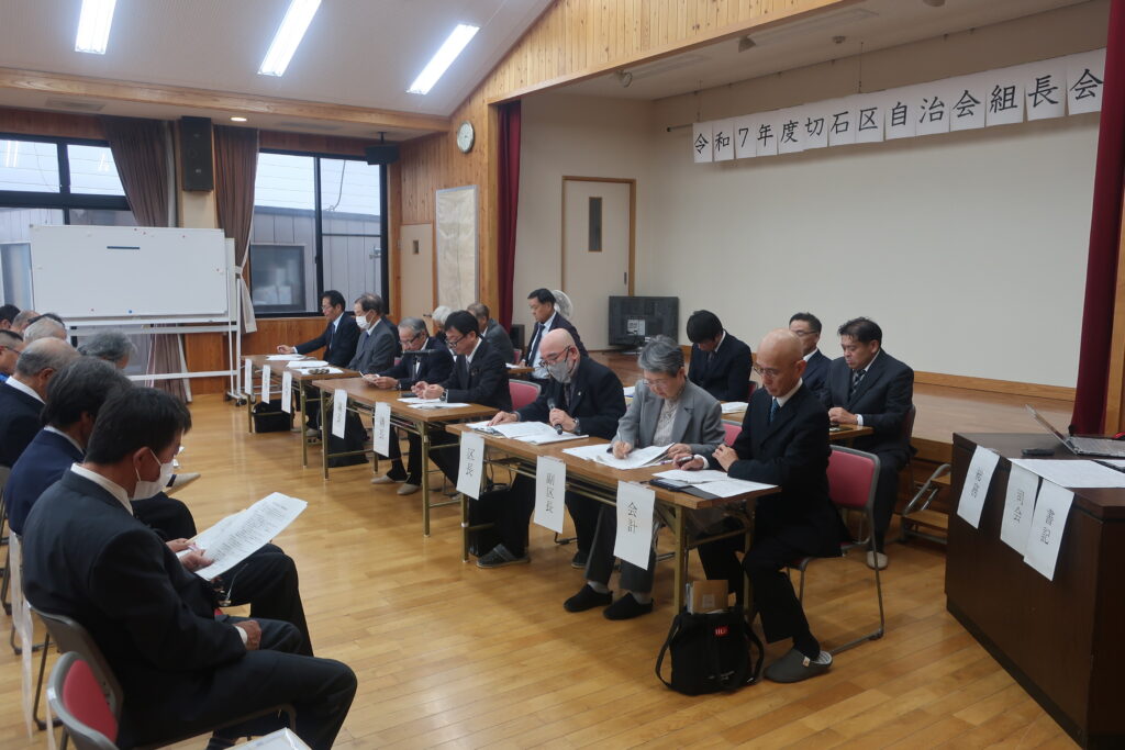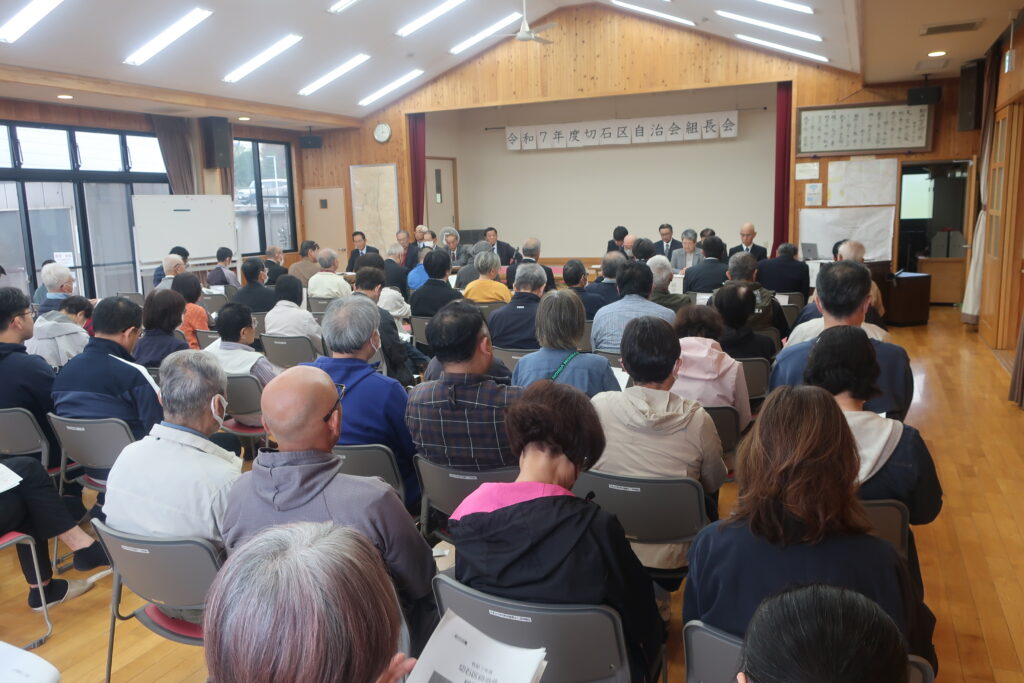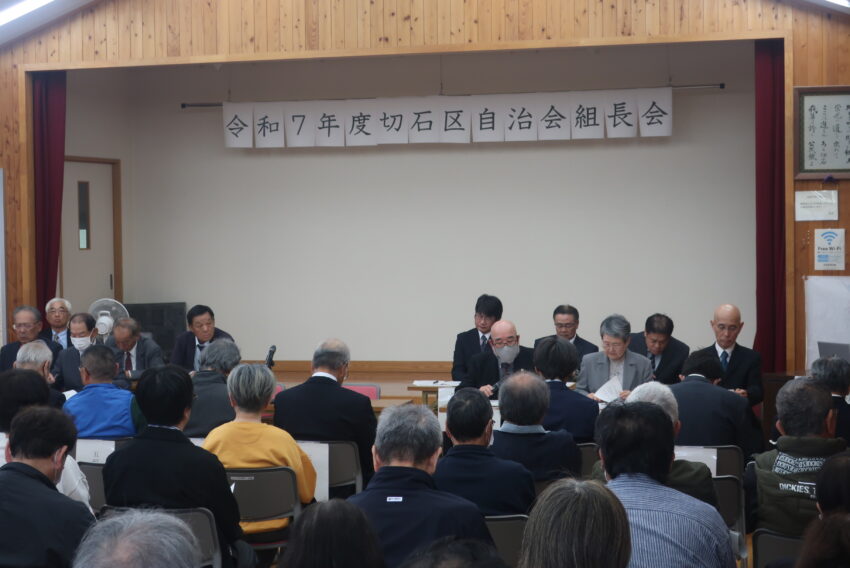 10月26日(日)午後3時から切石会館に於いて、切石区の組長と役員計89名が参加し、令和7年度切石区自治会組長会が開催され、担当役員より中間事業報告・中間会計報告、監事より中間監査結果の報告がありました。