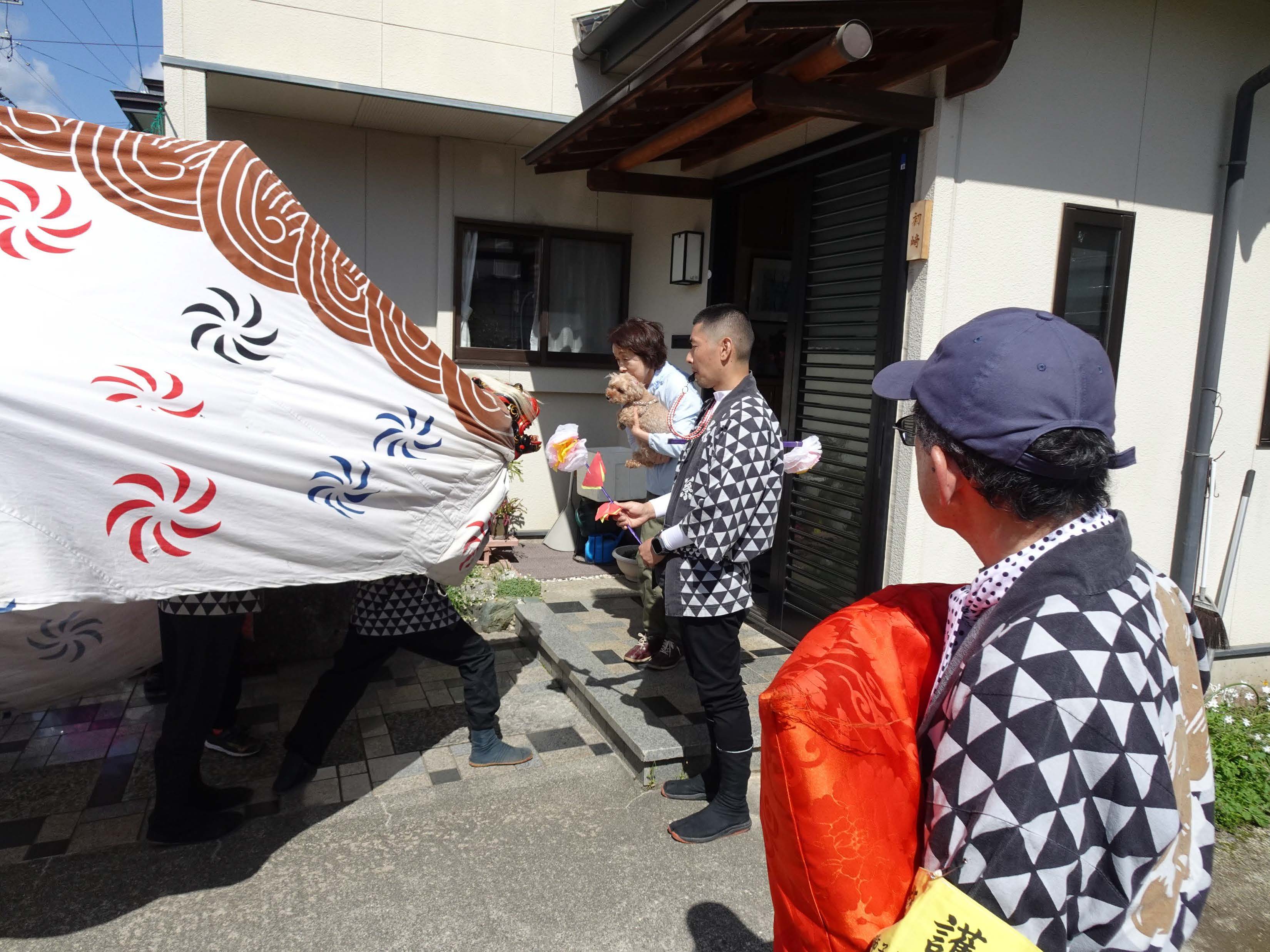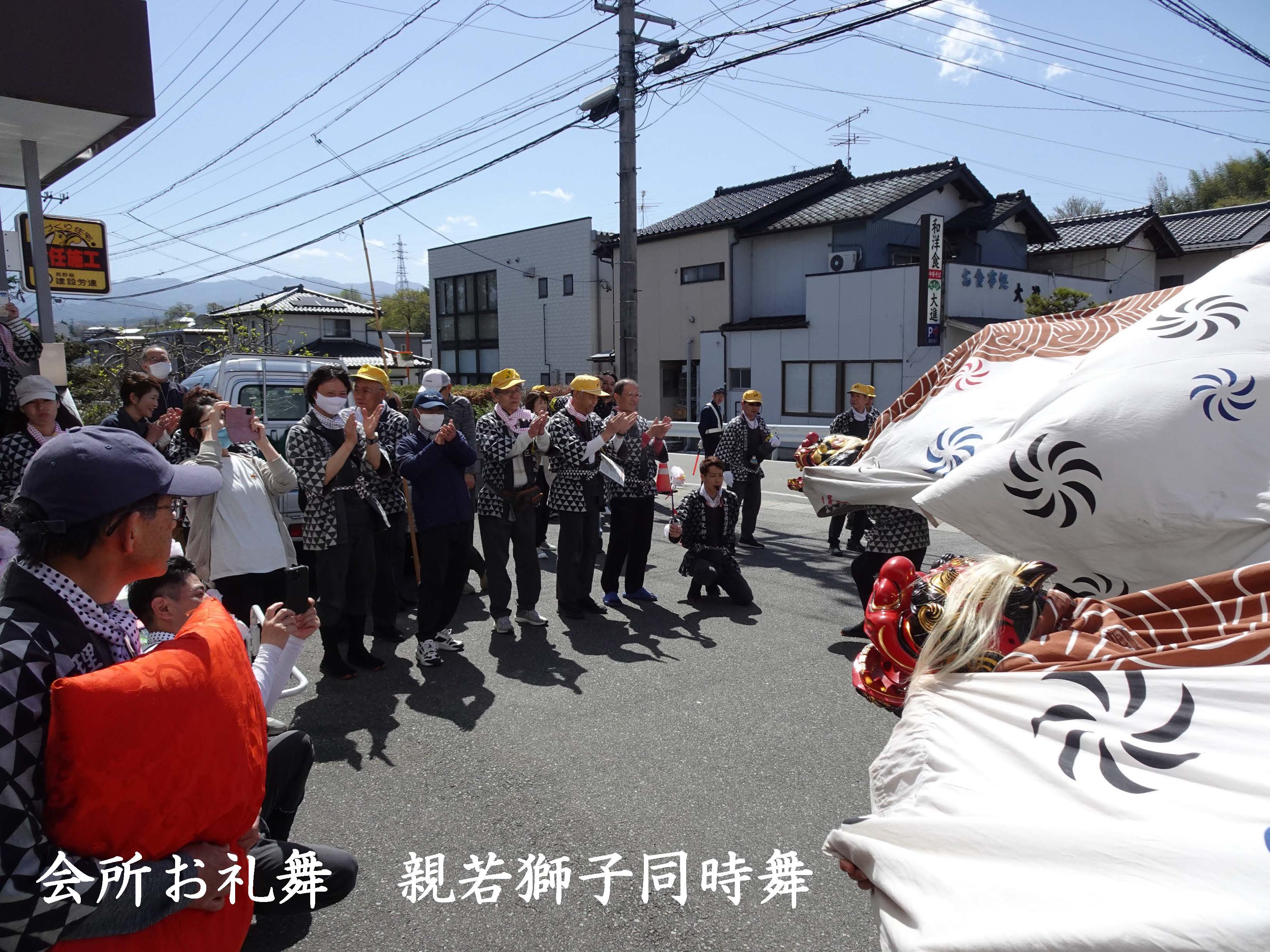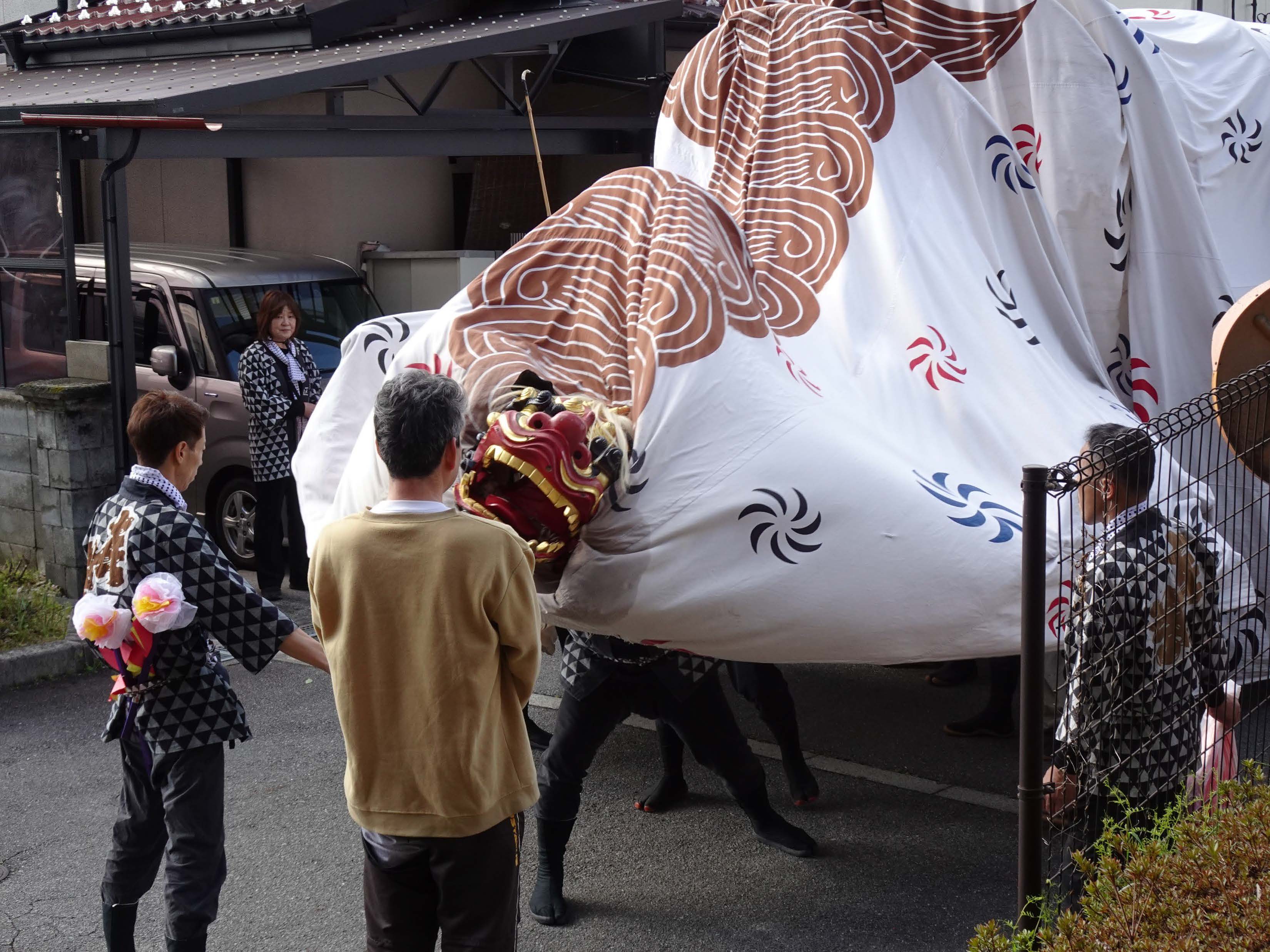4月11日(土)翌日までの大雨も上がった早朝6時過ぎ、下山獅子舞保存会役員、壮年団、PTA、こどもたち、区役員、組長の皆さんが参集し、令和8年度矢高諏訪神社春季祭典獅子舞奉納下山区内巡行が始まりました。初日は、区長、保存会長挨拶後、お神酒、こどもたちはジュースにより祝杯をあげ、親若獅子による親子同時舞からスタート。春風の青空にボタンの花が映える大きな屋台獅子が、所望をいただいた区民各戸の皆さんへ無病息災、家内安全を願い本舞を披露し区内を巡行しました。