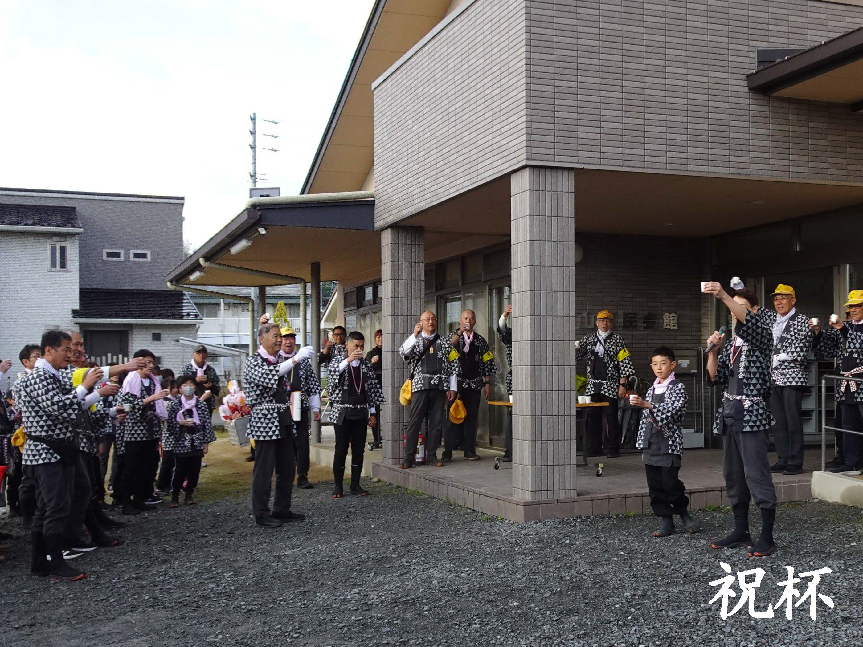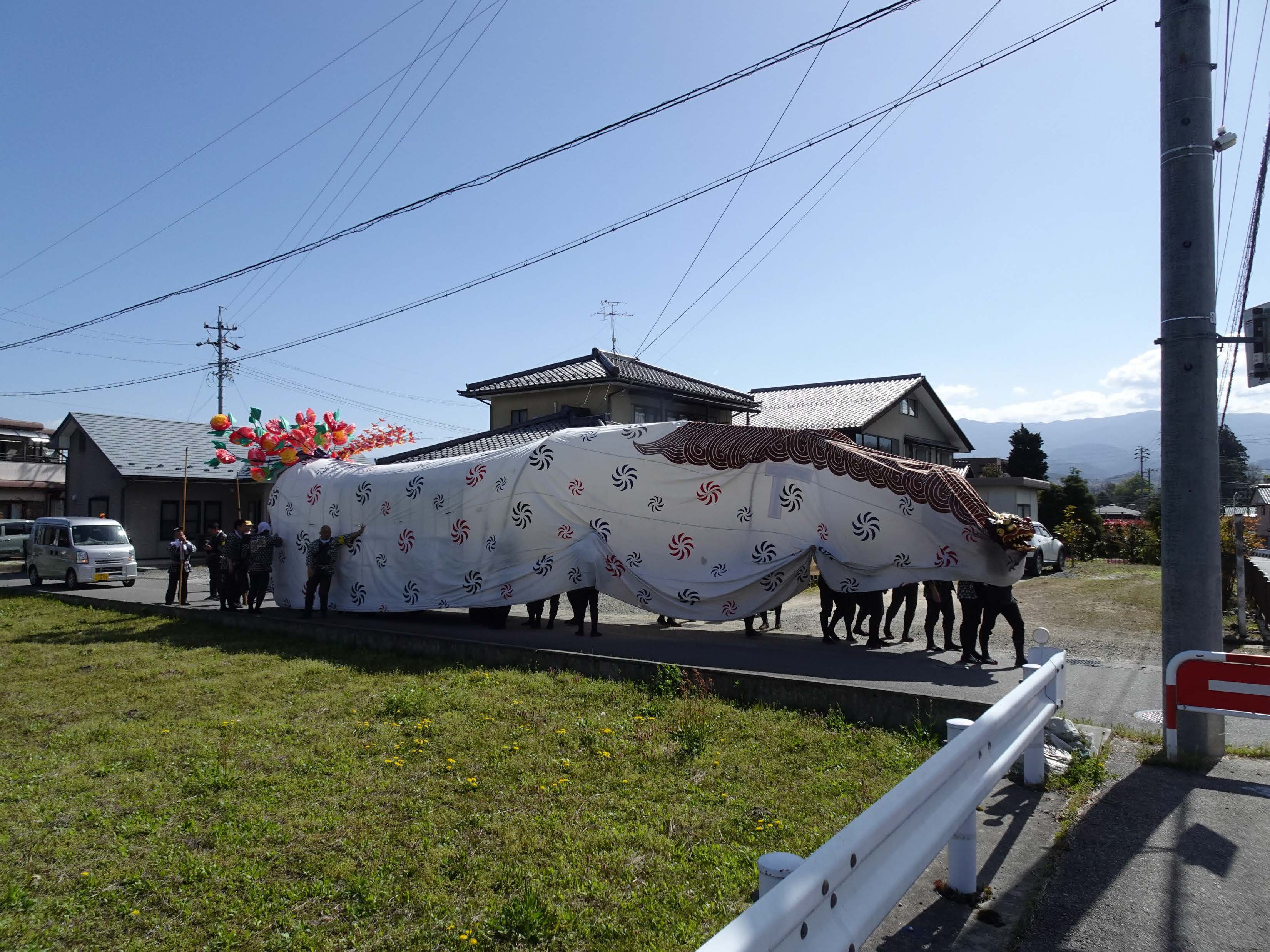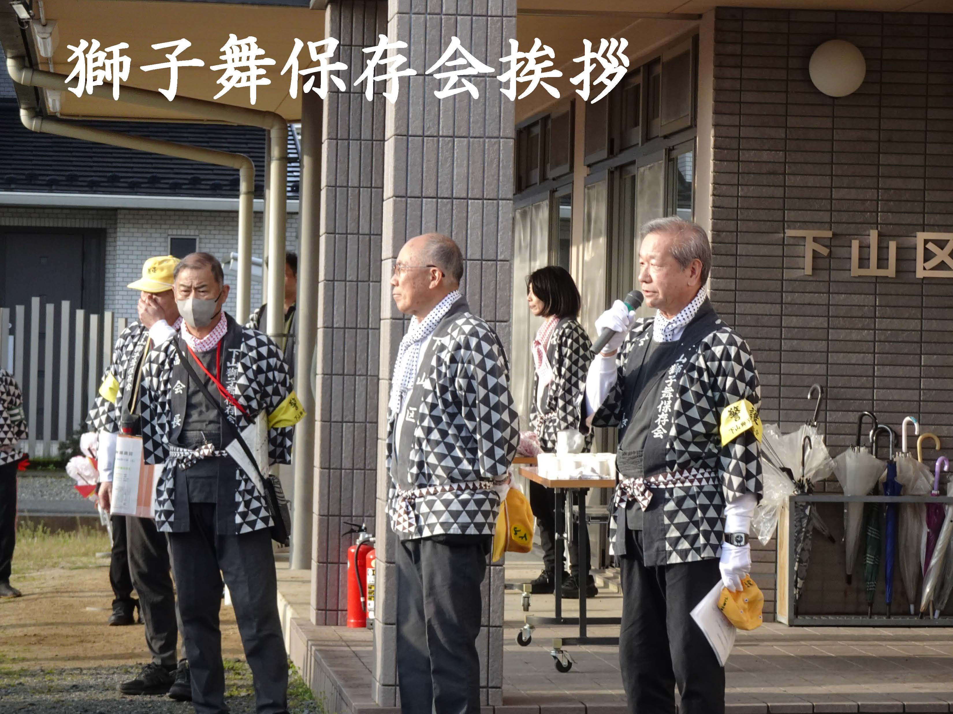 4月11日(土)翌日までの大雨も上がった早朝6時過ぎ、下山獅子舞保存会役員、壮年団、PTA、こどもたち、区役員、組長の皆さんが参集し、令和8年度矢高諏訪神社春季祭典獅子舞奉納下山区内巡行が始まりました。初日は、区長、保存会長挨拶後、お神酒、こどもたちはジュースにより祝杯をあげ、親若獅子による親子同時舞からスタート。春風の青空にボタンの花が映える大きな屋台獅子が、所望をいただいた区民各戸の皆さんへ無病息災、家内安全を願い本舞を披露し区内を巡行しました。