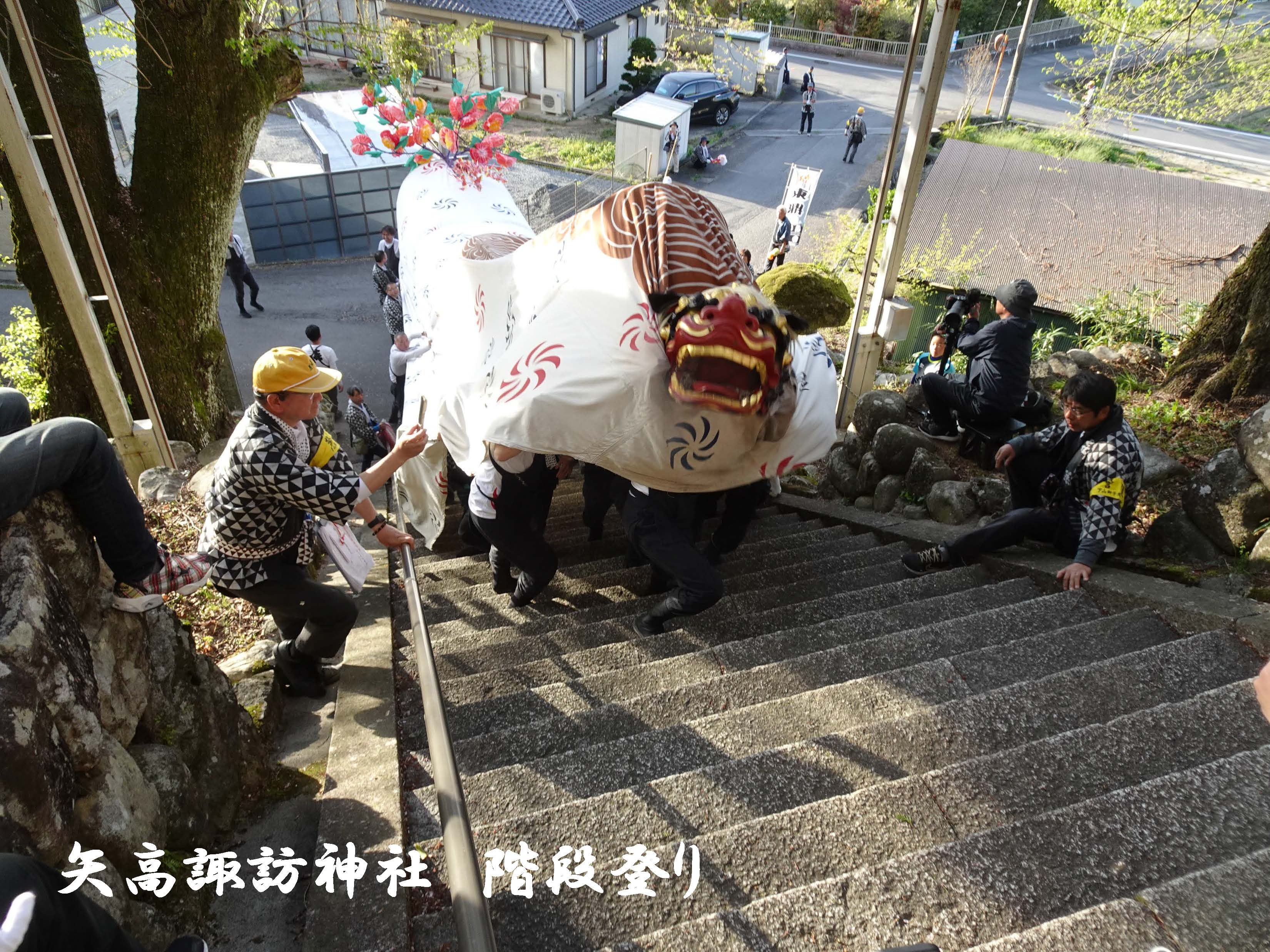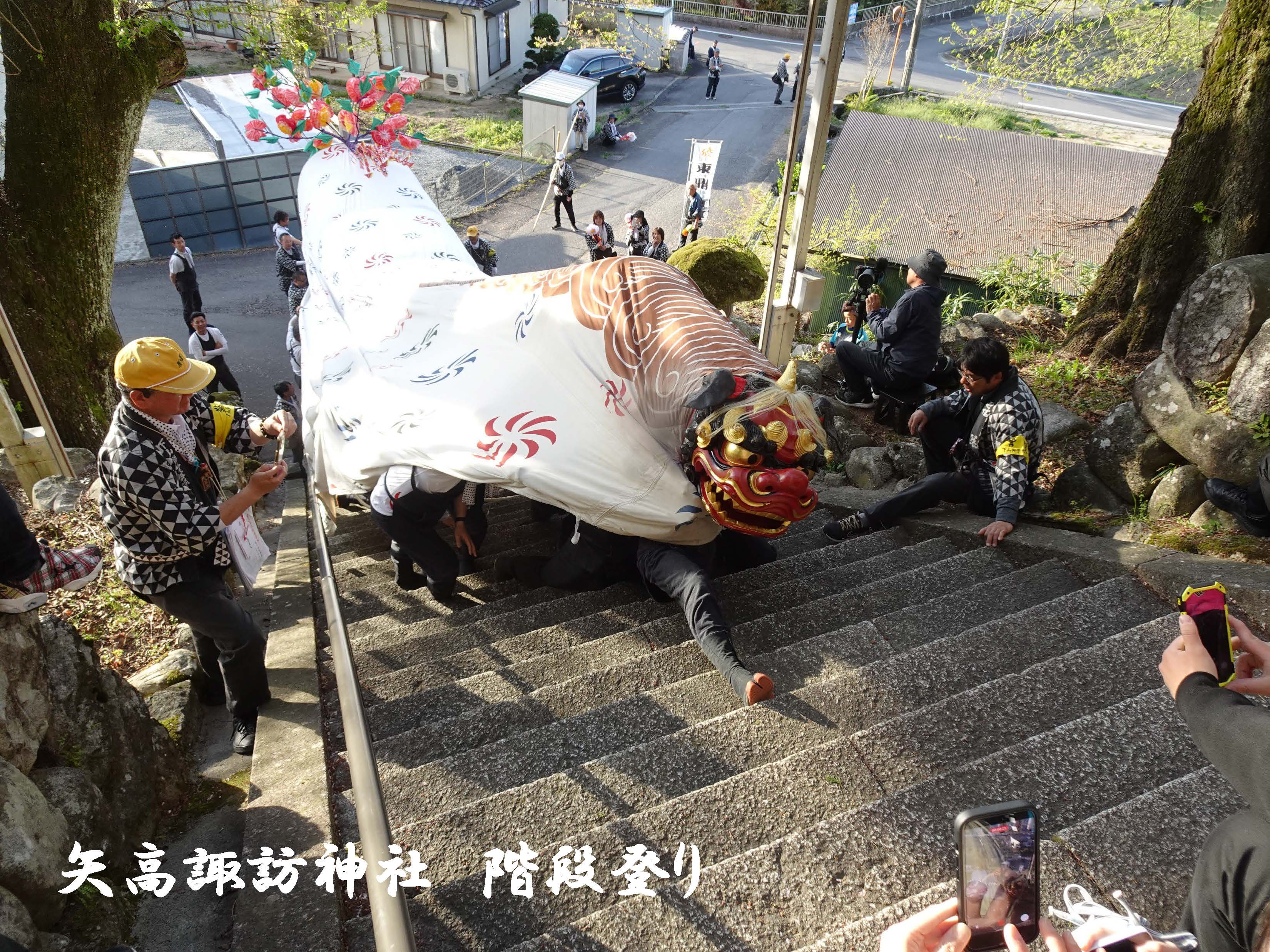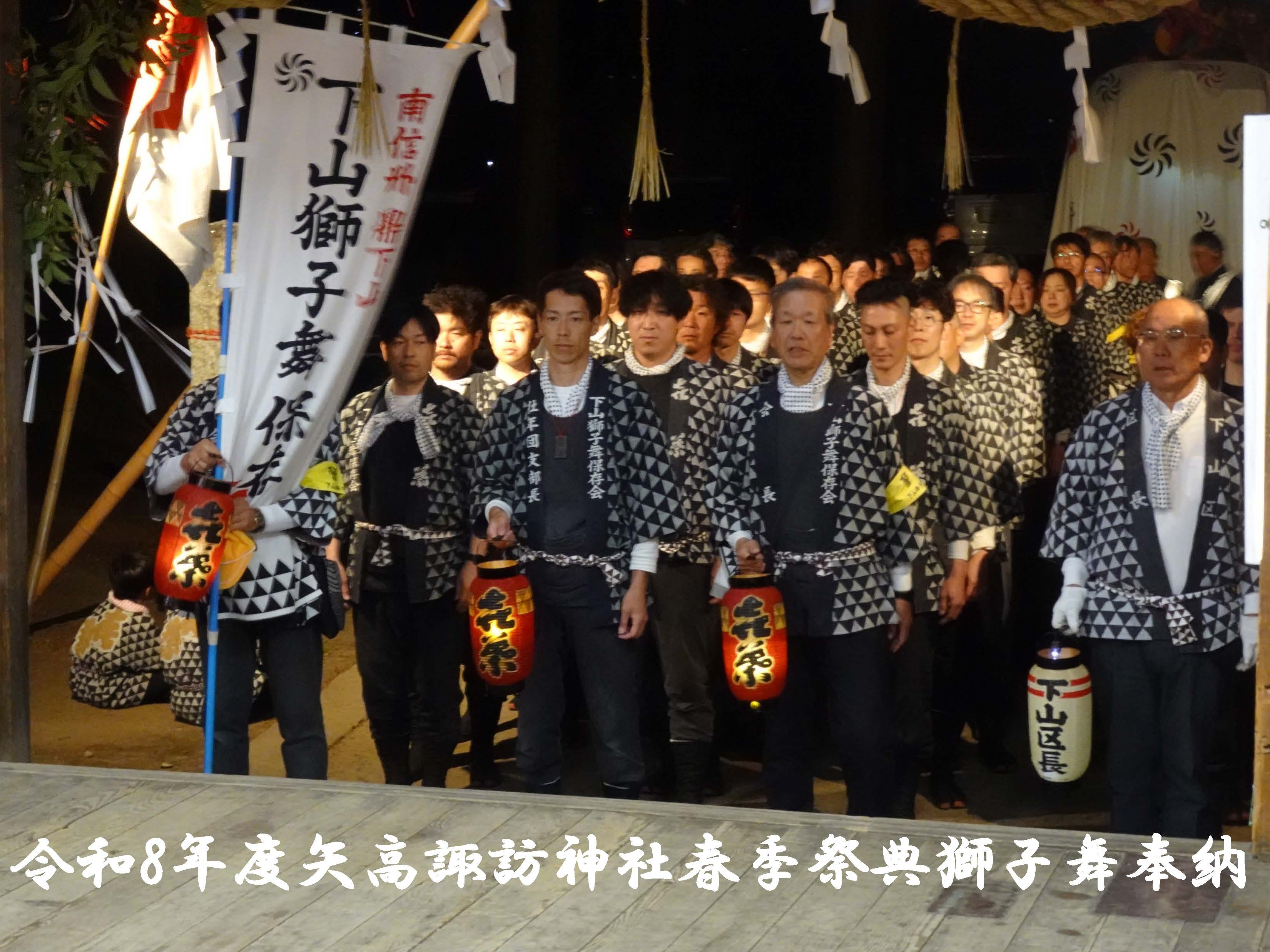4月12日(日)矢高諏訪神社春季祭典獅子舞奉納・下山区内巡行2日目。最高気温24℃の中、下山区内巡行、矢高諏訪神社への奉納へと階段下からの階段登り、牛草坂の秋葉様へ奉納後、日が暮れ厳かな矢高諏訪神社の境内へ入り、令和8年度矢高諏訪神社春季祭典獅子舞奉納を執り行いました。社殿では優雅で勇ましい下山一角獅子が、無事に区民のみなさまの無病息災・家内安全を祈願することができました。2日間にわたりご協力いただきました区民のみなさまには感謝申し上げます。