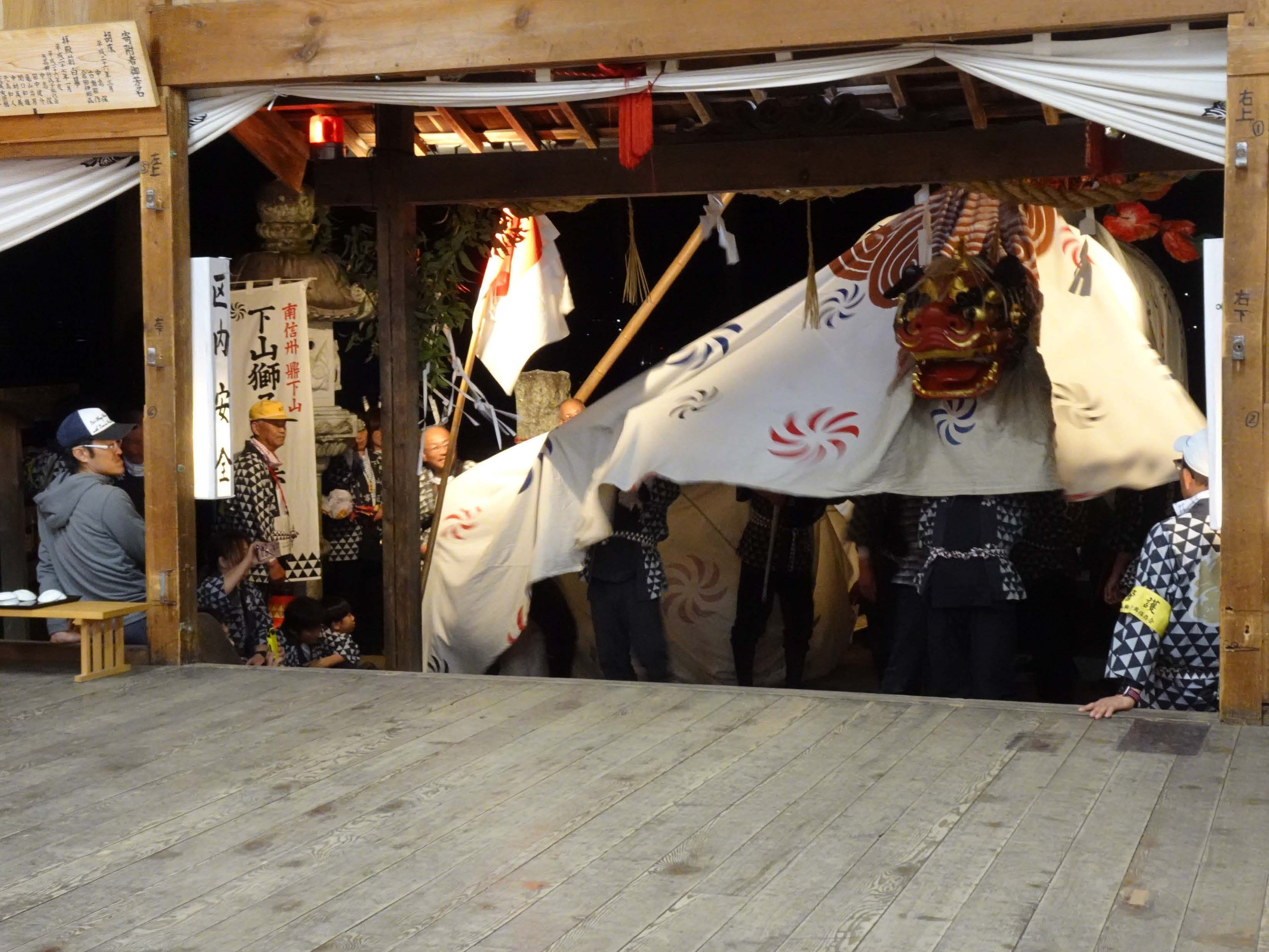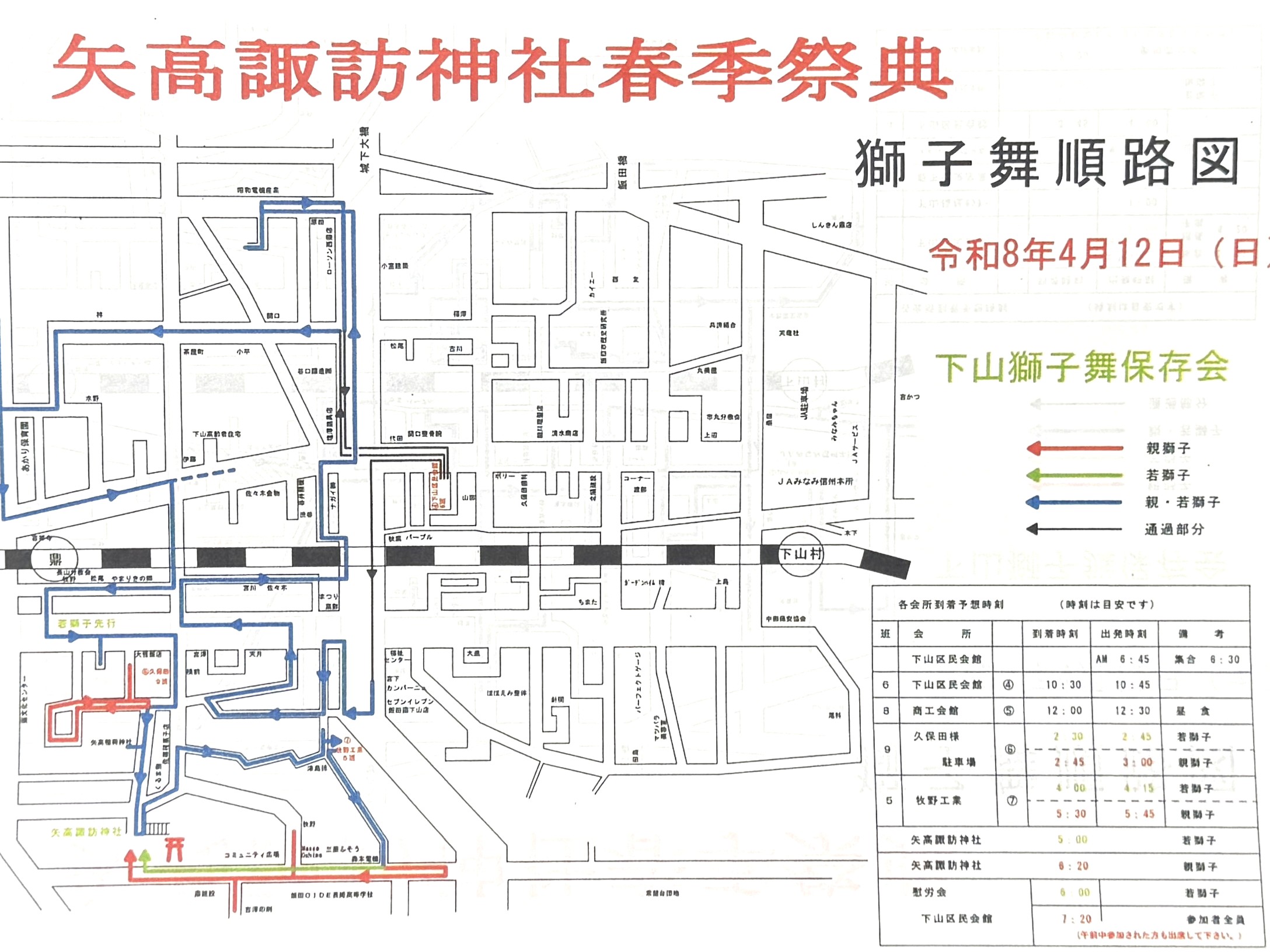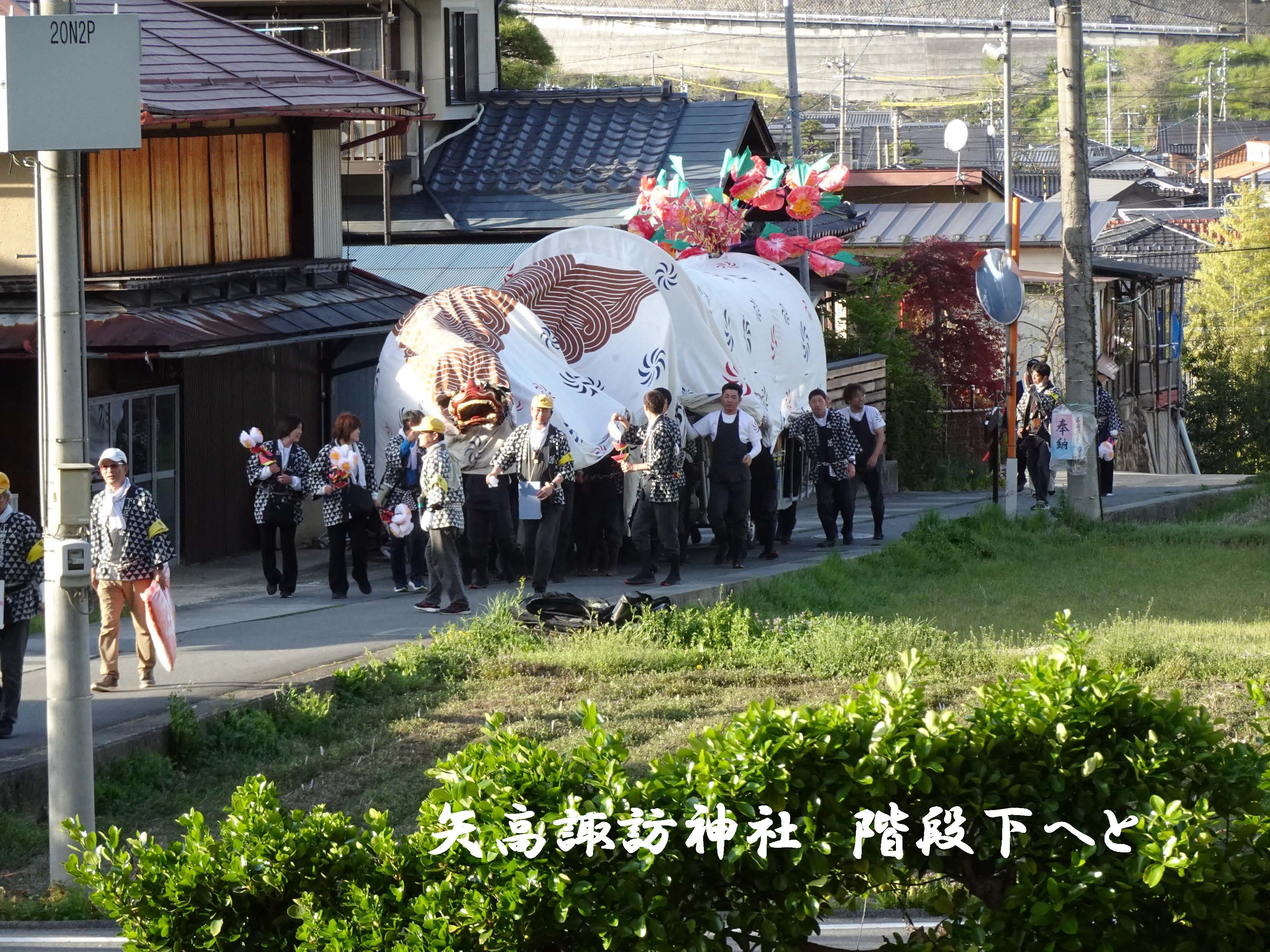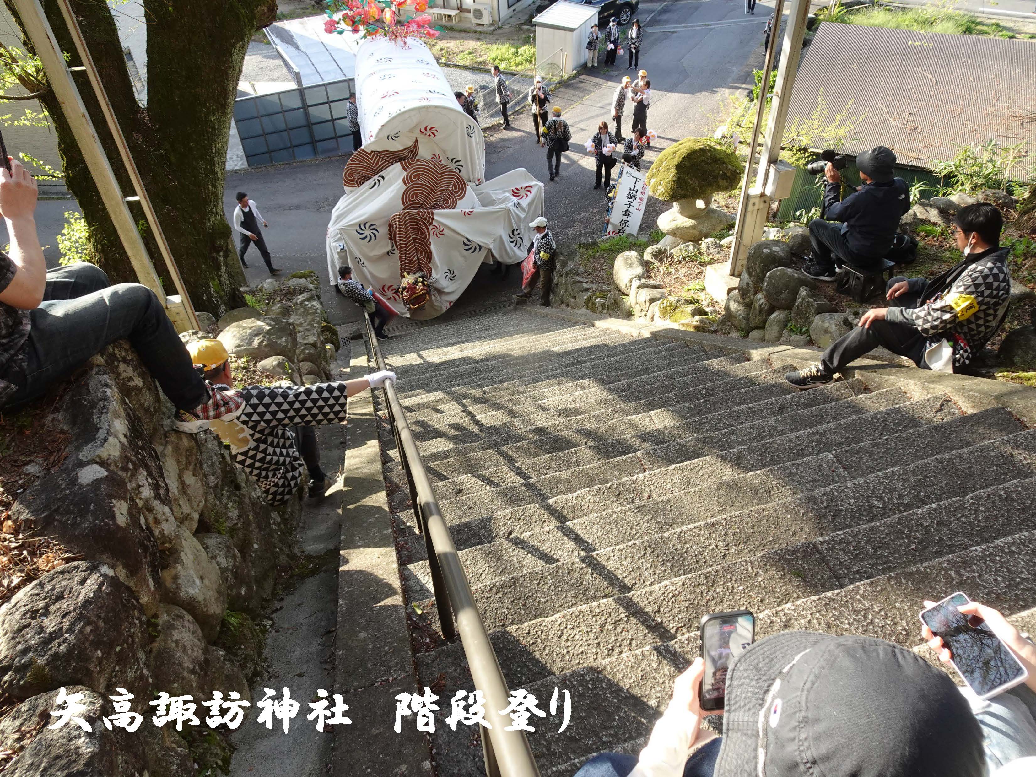 4月12日(日)矢高諏訪神社春季祭典獅子舞奉納・下山区内巡行2日目。最高気温24℃の中、下山区内巡行、矢高諏訪神社への奉納へと階段下からの階段登り、牛草坂の秋葉様へ奉納後、日が暮れ厳かな矢高諏訪神社の境内へ入り、令和8年度矢高諏訪神社春季祭典獅子舞奉納を執り行いました。社殿では優雅で勇ましい下山一角獅子が、無事に区民のみなさまの無病息災・家内安全を祈願することができました。2日間にわたりご協力いただきました区民のみなさまには感謝申し上げます。