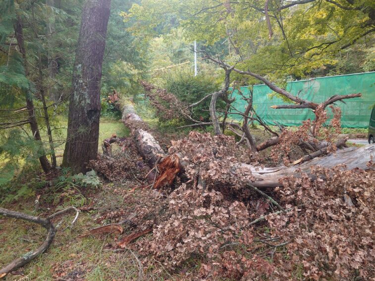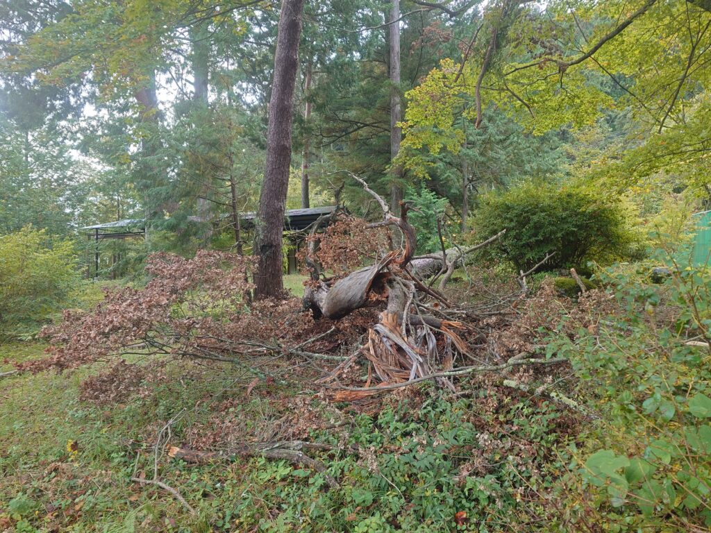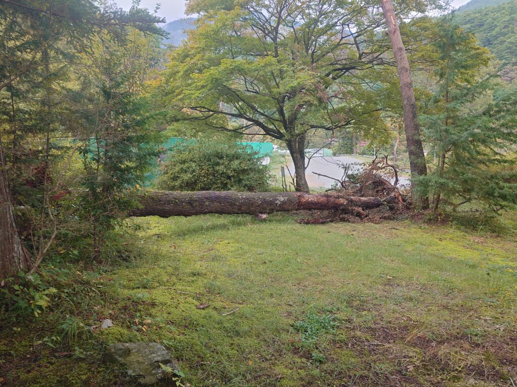 妙琴愛護会長・切石区長(妙琴愛護会名誉会長)が現地を確認したところ、公園内に他にも枯れ松が複数あることが判明したため、飯田市維持管理課へ連絡を行い、同日、公園およびキャンプ場を緊急閉鎖としました。10月27日には飯田市維持管理課による現地確認が実施されましたが、倒れた枯れ松については早期に処理できるが、公園全体に松くい虫の被害が疑われる木が複数確認されているので、妙琴公園は当面閉鎖とし、そのまま冬季閉鎖に入る予定となりました。