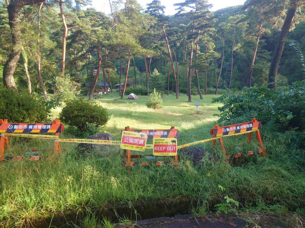 奥に見えるテントは放置された空きテントです。公園再開後に撤収に来るようです。